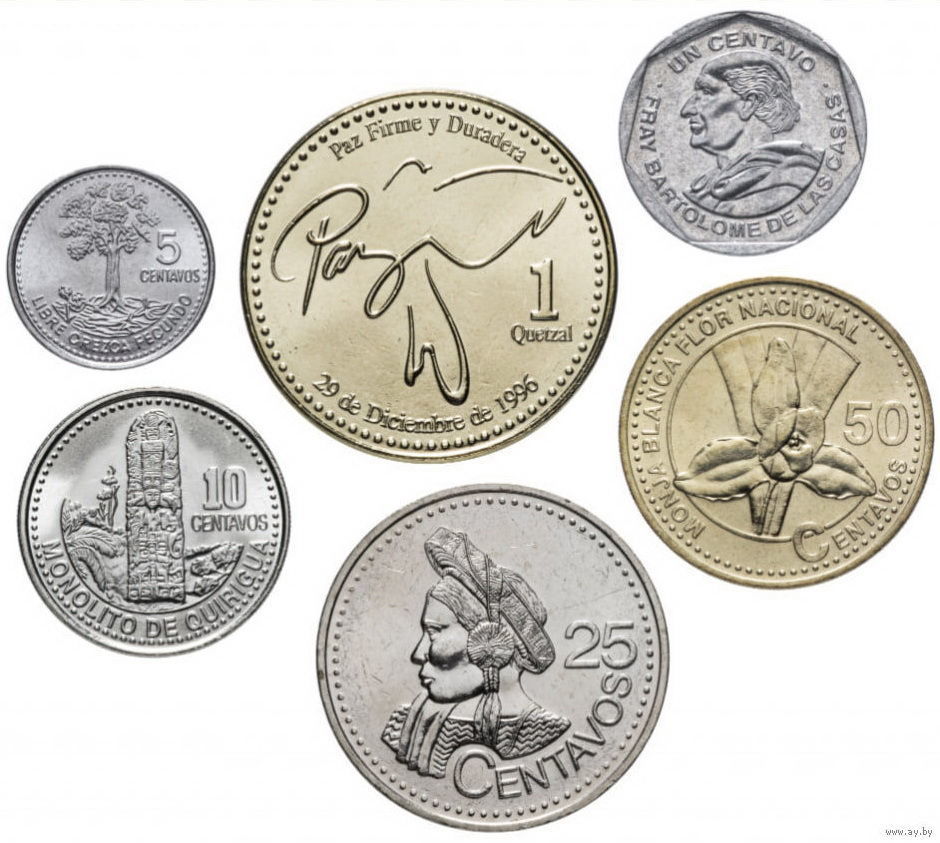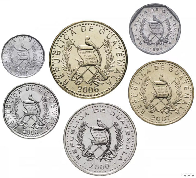 Гватемала набор монет 1, 5, 10, 25, 50 центавос, 1 Кетсаль, UNC. Сторгуй за свою цену, предложи обмен!