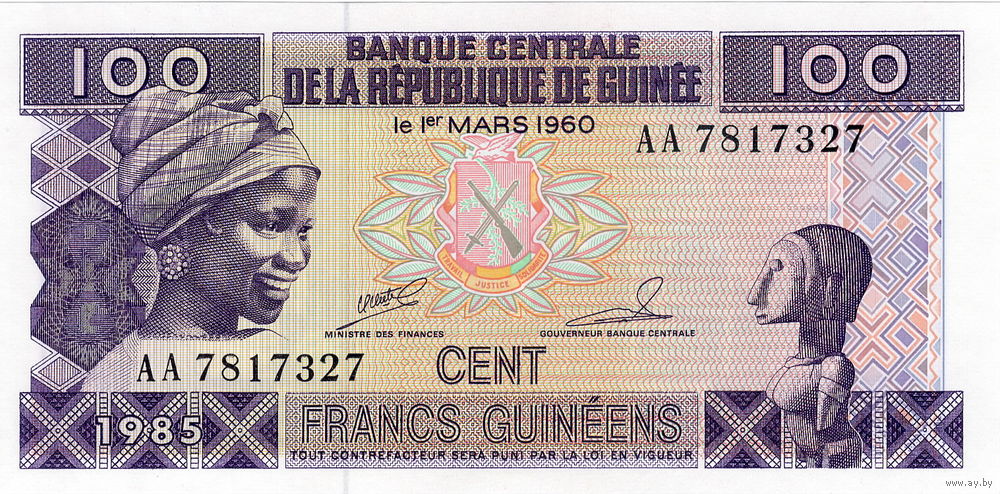 Гвинея, 100 франков, 1985 г., P-30a, первая серия AA, UNC