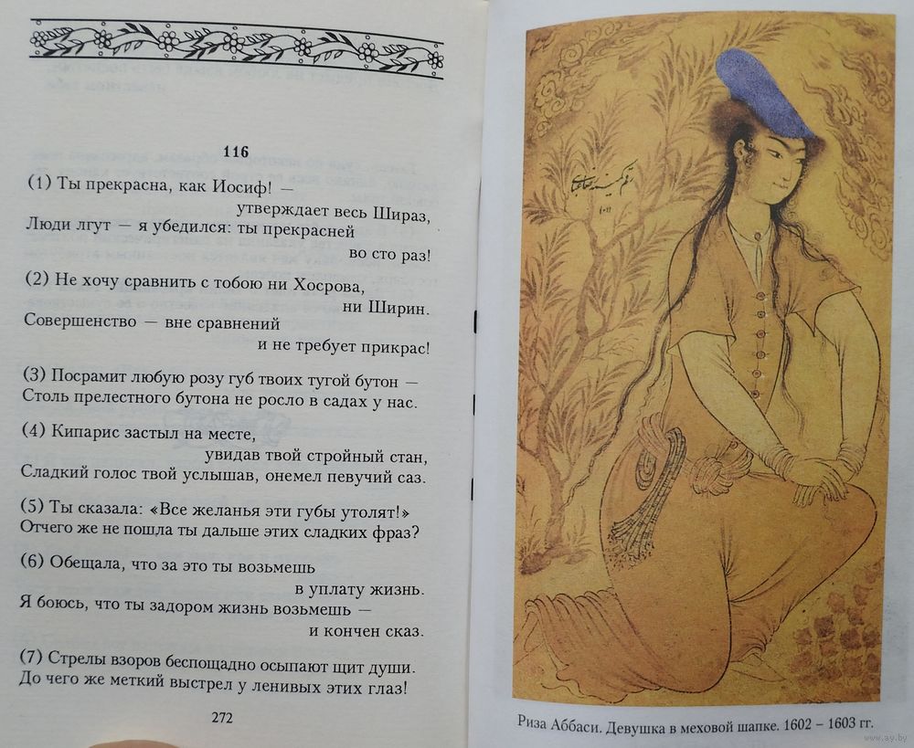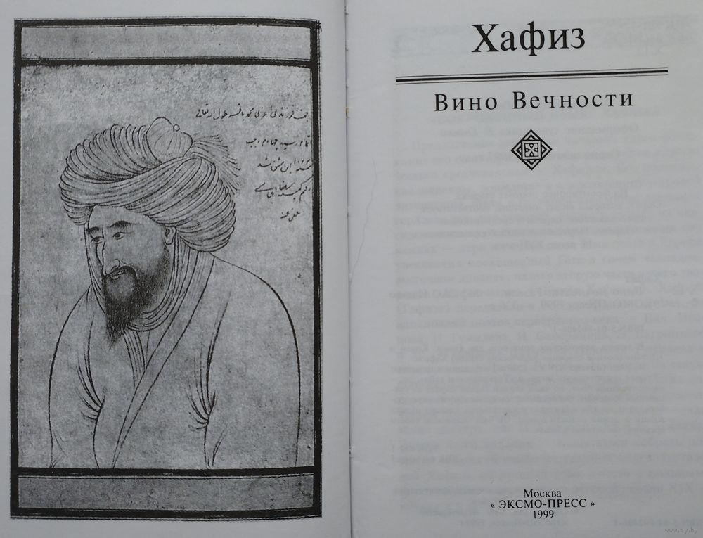 Тираж 10000 экз. 338 стр. Ляссе. Знаменитый персидско-таджикский мастер лирического слова Шамсуддин Мухаммад Хафиз Ширази затрагивает самые тайные струны сердца и услаждает слух особенными, загадочными стихами-газелями. Чудесные стихи Хафиза пронизаны особенной мистической прелестью и таинственным очарованием. Возможно, они по-настоящему обладают пророческими свойствами. В начале книги составители поместили статью под названием "Сокровенный язык Хафиза" о наследии средневекового персидского лирика. Далее Вы можете прикоснуться к страницам легендарной биографии Хафиза Ширази: истории о волшебном ниспослании ему поэтического дара, о трудных жизненных испытаниях, покровителях и властителях, а также о возлюбленной по имени Шах-Набат. В книге "Вино вечности" также размещено несколько рассказов об удивительных случаях гадания по "Дивану" Хафиза. Эти истории происходили как в прошедшие времена, так и в наши дни. Название книги означает вечную, настоящую, божественную любовь и стремление к истине. Эти мотивы являются основными в поэзии Хафиза. Он рассматривает жизнь под знаком вечности с мистической точки зрения. Именно поэтому восточная поэзия интересна и актуальна в наши дни. Хафиз Ширази - это страстный поэт, в его лирике я нахожу всё то, что продолжает и сейчас волновать человечество.