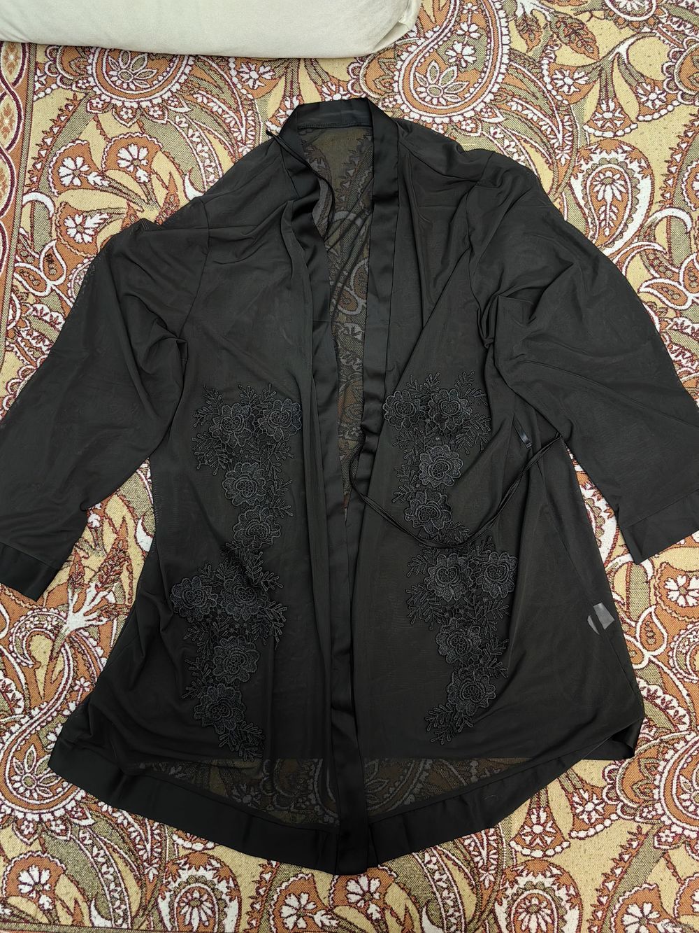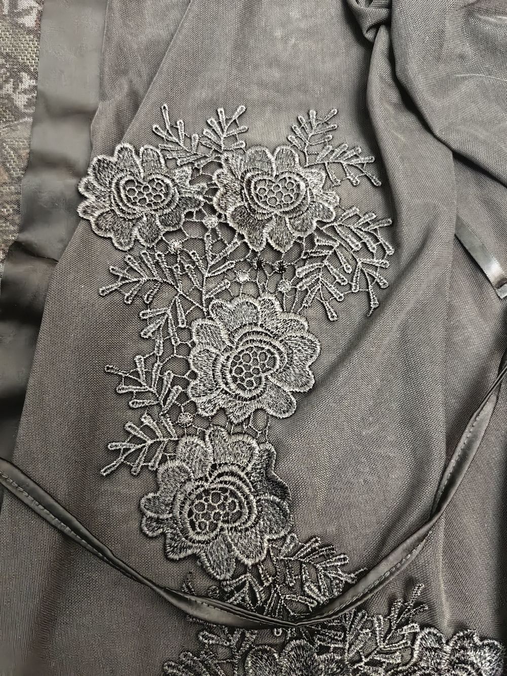 Кружевной халат. Мягкая струящаяся сетка обволакивает тело, словно прикосновение летнего ветерка, даря ощущение невесомости и свободы. Каждый элемент кружева, словно тончайшая паутинка, сплетен в изысканный узор, притягивающий взгляд и завораживающий своей хрупкостью и изысканностью.