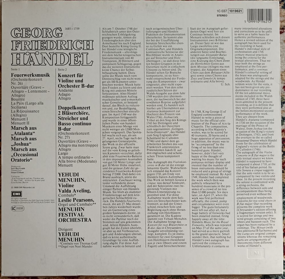 Handel, Yehudi Menuhin, Menuhin Festival Orchestra – Feuerwerksmusik, Violinkonzert. Doppelchoriges Orchesterkonzert B-dur
