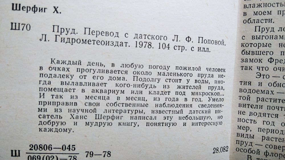 Каждый день, в любую погоду пожилой человек прогуливается около маленького пруда неподалеку от своего дома. Подолгу стоит у воды, иногда вылавливает кого-нибудь из жителей пруда, помещает в аквариум или кладет под микроскоп… И так из месяца в месяц, из года в год. Пруд о котором в книге идет речь находится в Дании на широте Москвы. Умело приправив свои собственные наблюдения сведениями из научной литературы, известный датский писатель Ханс Шерфинг написал эту небольшую, но добрую и мудрую книгу, понятную и интересную каждому.