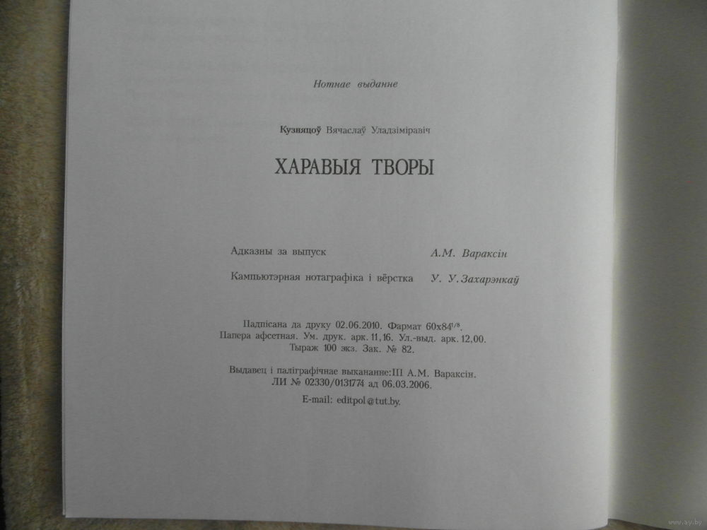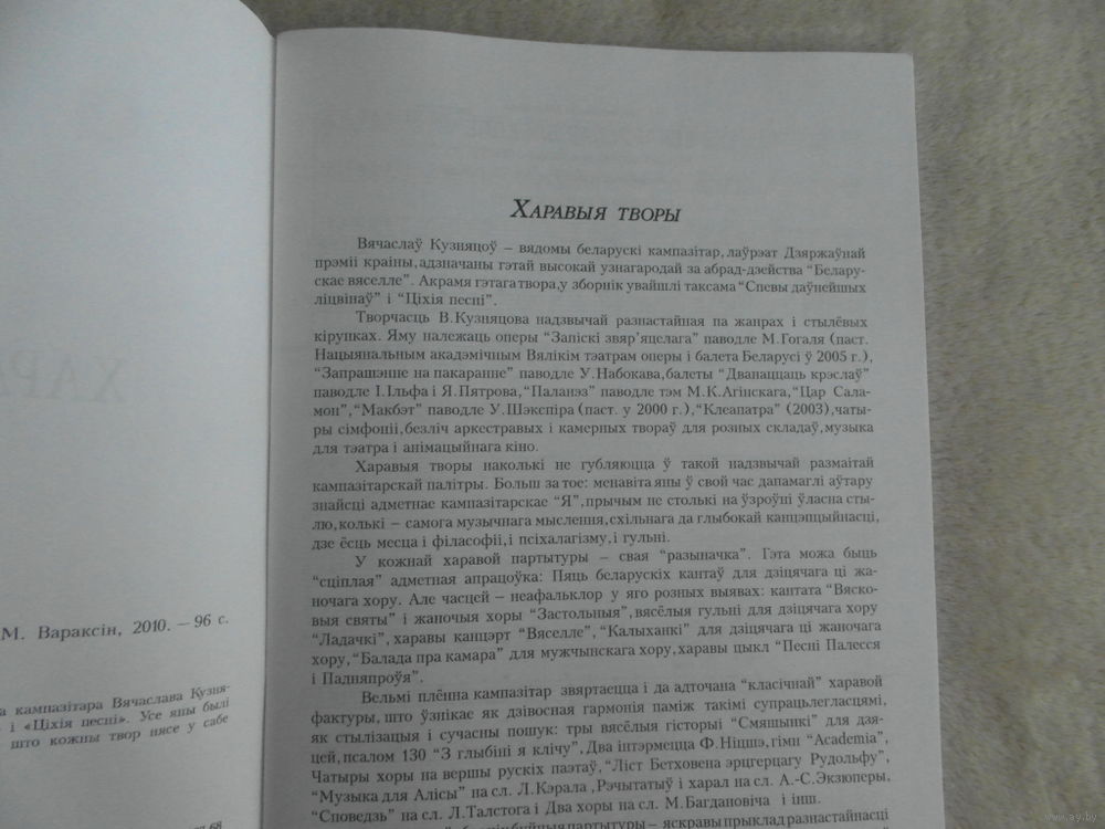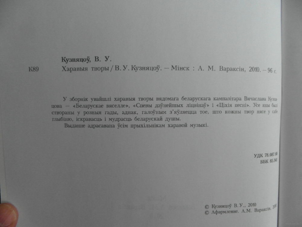 Харавыя творы. Ноты. Для хароў розных саставаў без суправаджэння і ў суправаджэнні ударных інструментаў. Вячаслаў Кузняцоў. Тыраж 100 экз. Мінск : А. М. Вараксін , 2010