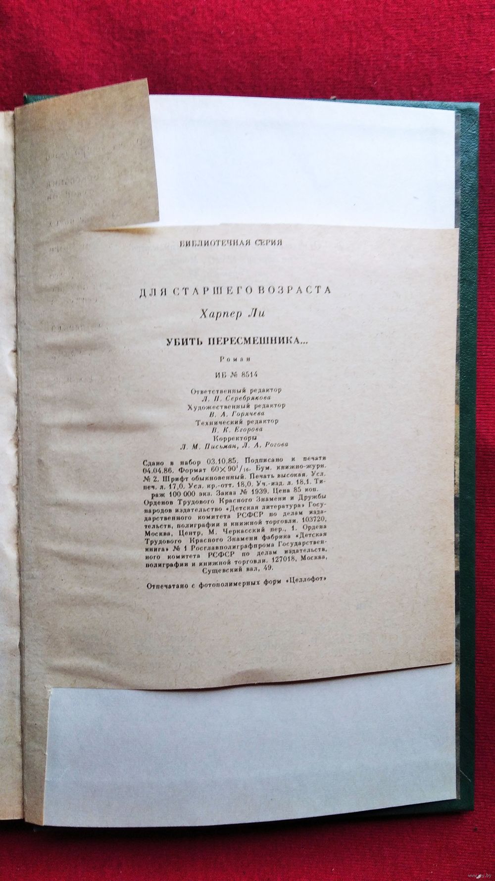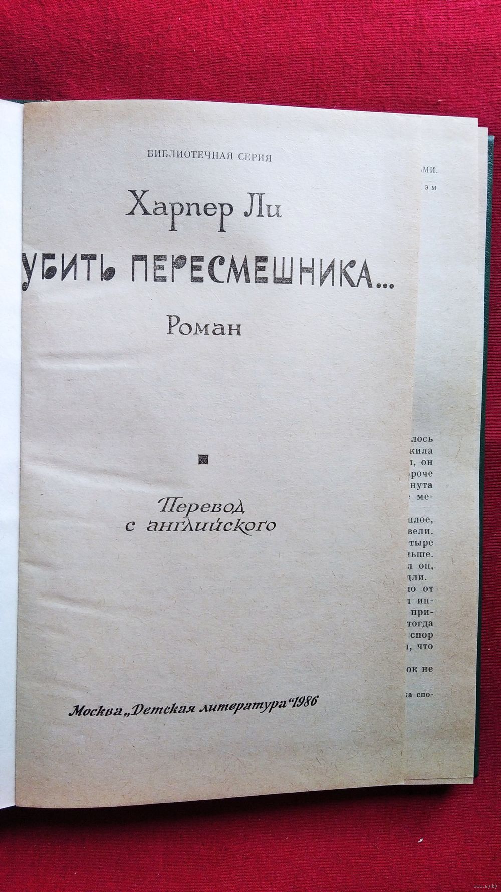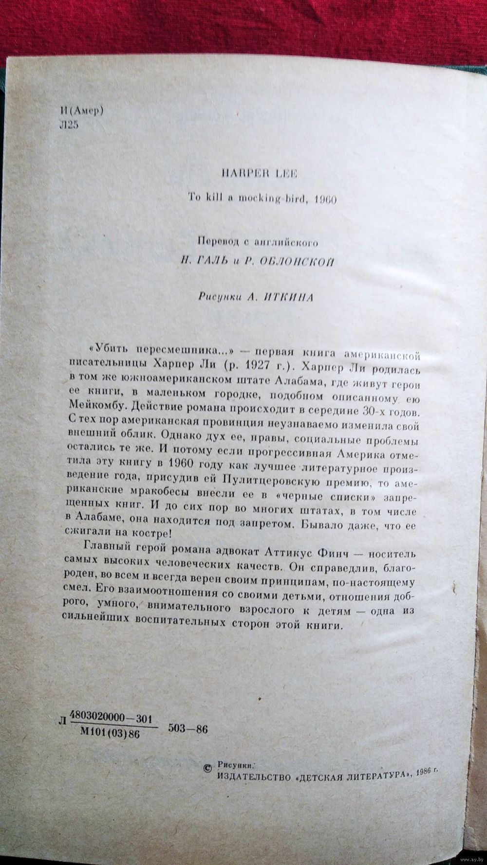 Действие происходит в 30-х годах. Главный герой романа адвокат Аттикус Финч — носитель самых высоких человеческих качеств. Он справедлив, благороден, верен своим принципам. Его отношения со своими детьми, отношения доброго, умного, внимательного взрослого к детям — одна из сильнейших воспитательных сторон этой книги. Во многих штатах эта книга находится под запретом. Бывало даже, что ее сжигали на костре!