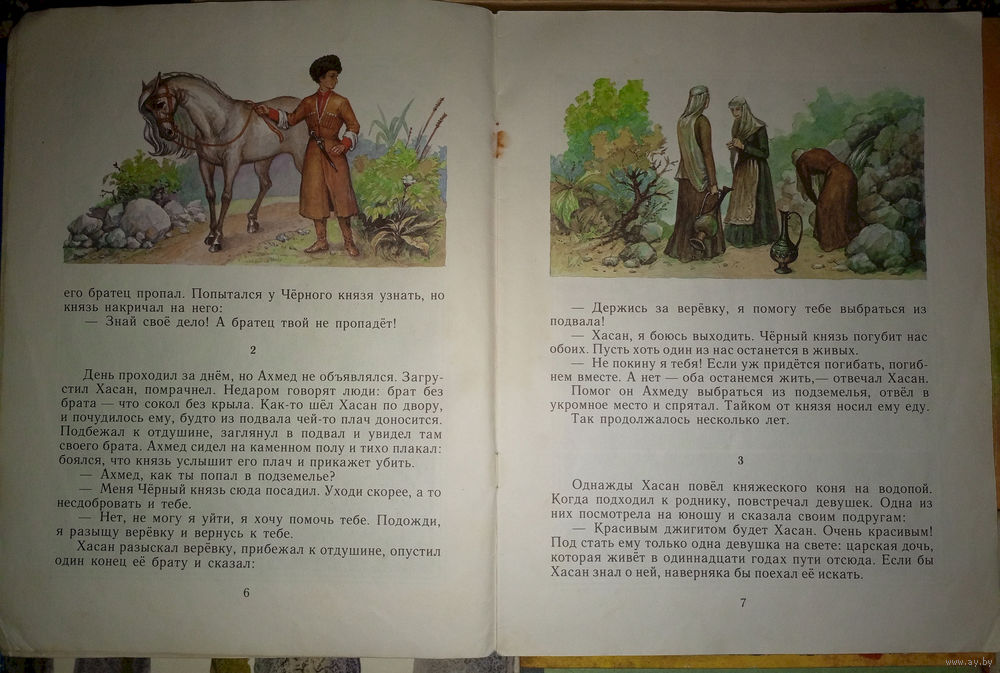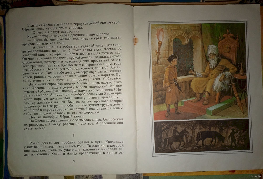 Далее рассказывается о том, как Хасан узнаёт о царской дочери, которая живёт далеко, и решает поехать её искать. Братья отправляются в путь и за десять лет из юношей превращаются в джигитов.