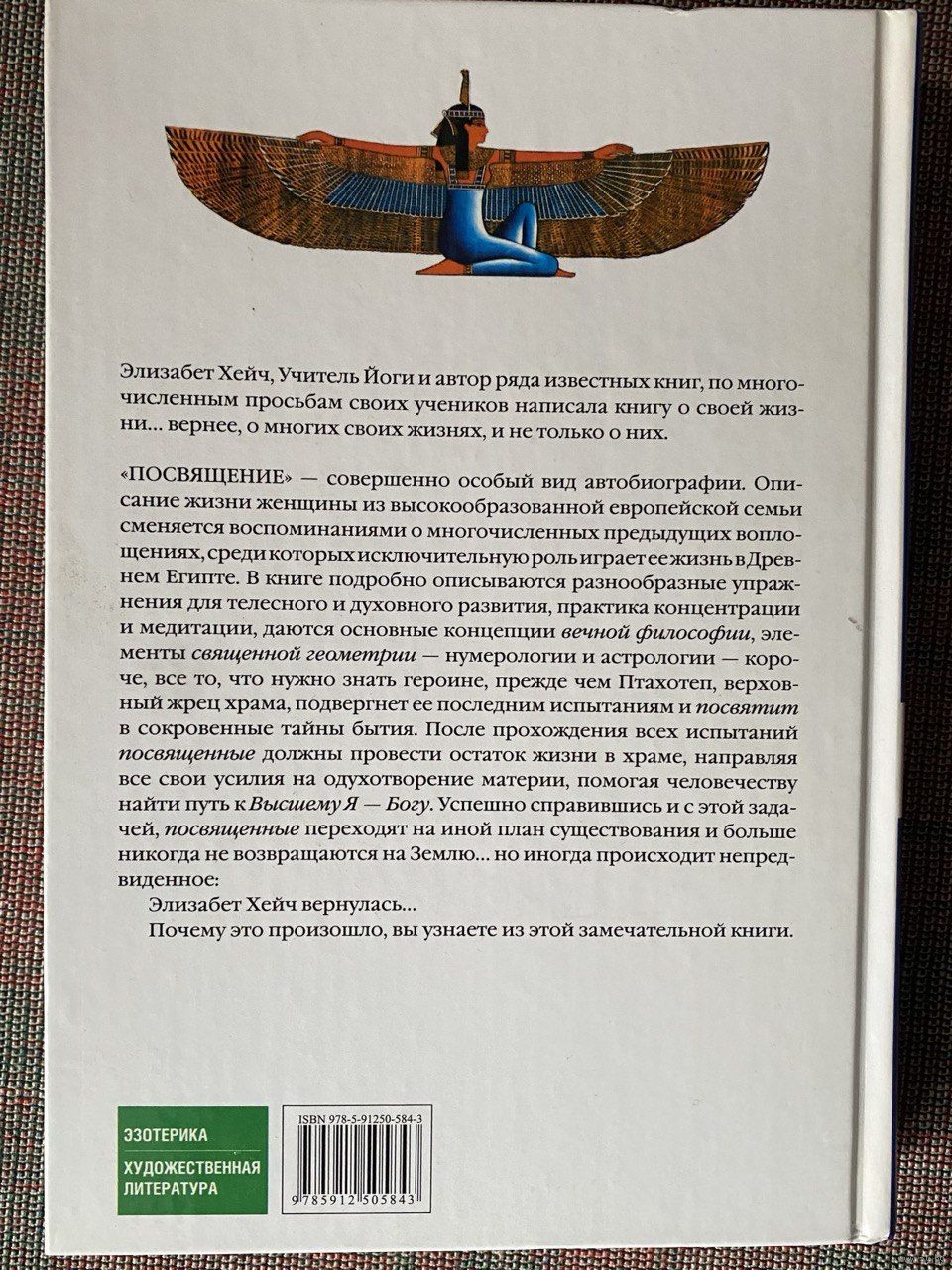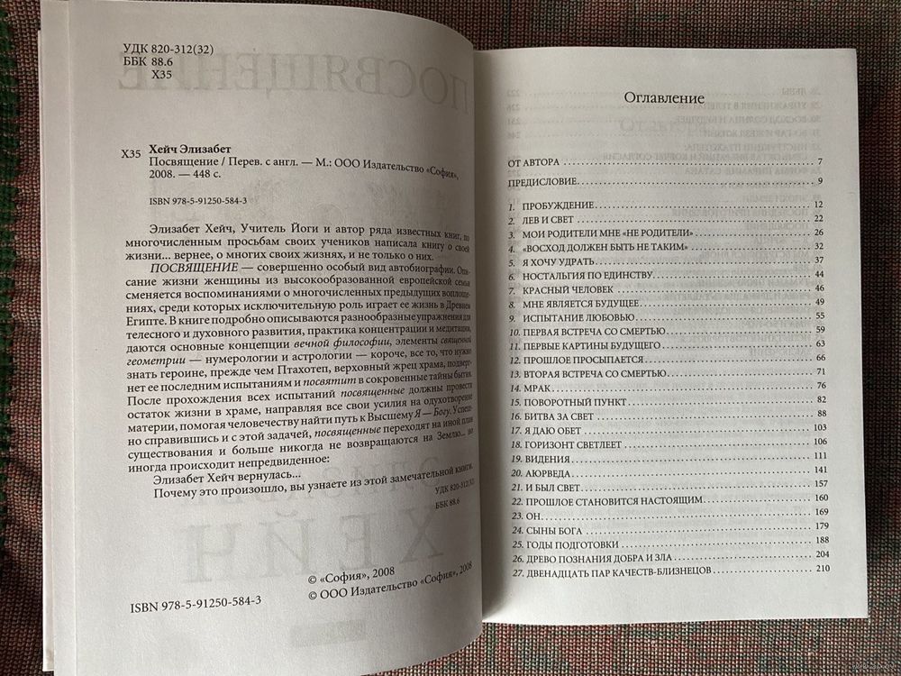 Элизабет Хейч, человек, обладающий огромным духовным опытом, принявшая в одной из своих прошлых жизней высочайшее посвящение, рассказывает о путях становления души человека, о космических законах эволюции, о тайном знании египетских жрецов, добровольно принявших на себя долг духовной помощи людям Земли. Для всех интересующихся эзотерическим знанием. Элизабет Хейч (Elisabeth Haich, 1897-1994) - мистик и писатель. Родилась в Будапеште. В 1939 начала преподавать йогу. В конце Второй мировой войны была вынуждена покинуть Венгрию. Вместе с со своим учеником Сельвараджаном Йесудианом поселилась в Швейцарии, где прожила до конца своих дней. Там они основали старейшую в Европе школу йоги. В 1953 написала свою наиболее известную книгу «Посвящение».