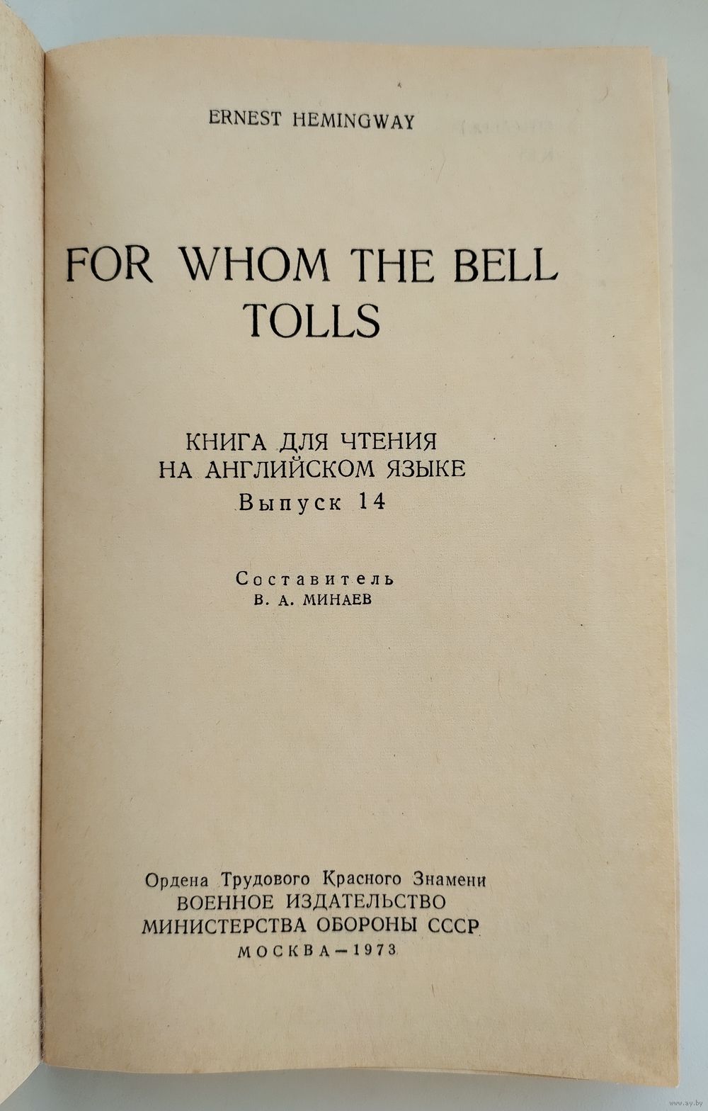 Hemingway Ernest. For Whom The Bell Tolls // Хемингуэй Эрнест. По ком звонит колокол. Книга для чтения на английском языке. Выпуск 14. М.: Воениздат, 1973г., 230 с. Твёрдый переплёт, уменьшенный формат.