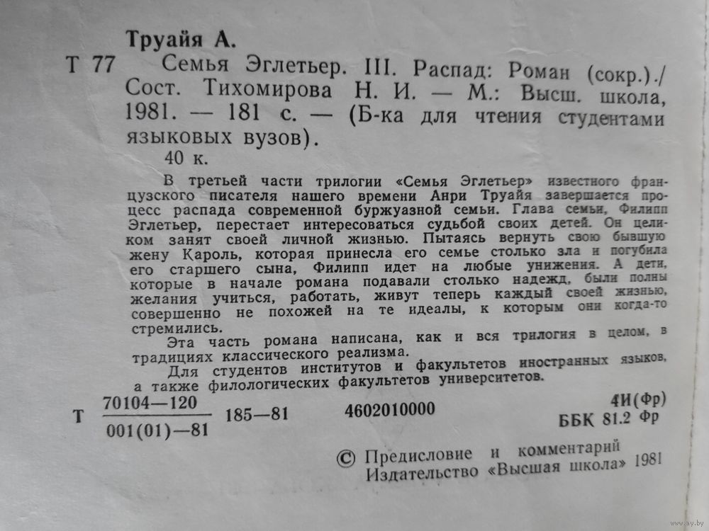 А. Труайя. Семья Эглетьер. III. Распад: Роман (сокр.)./ Сост. Тихомирова Н. И.