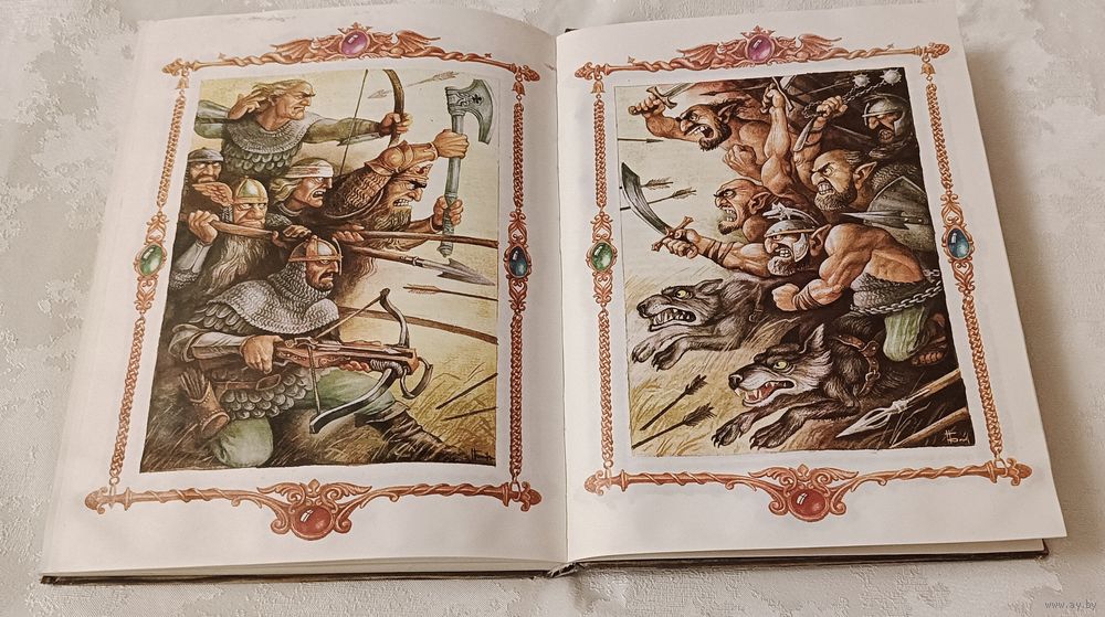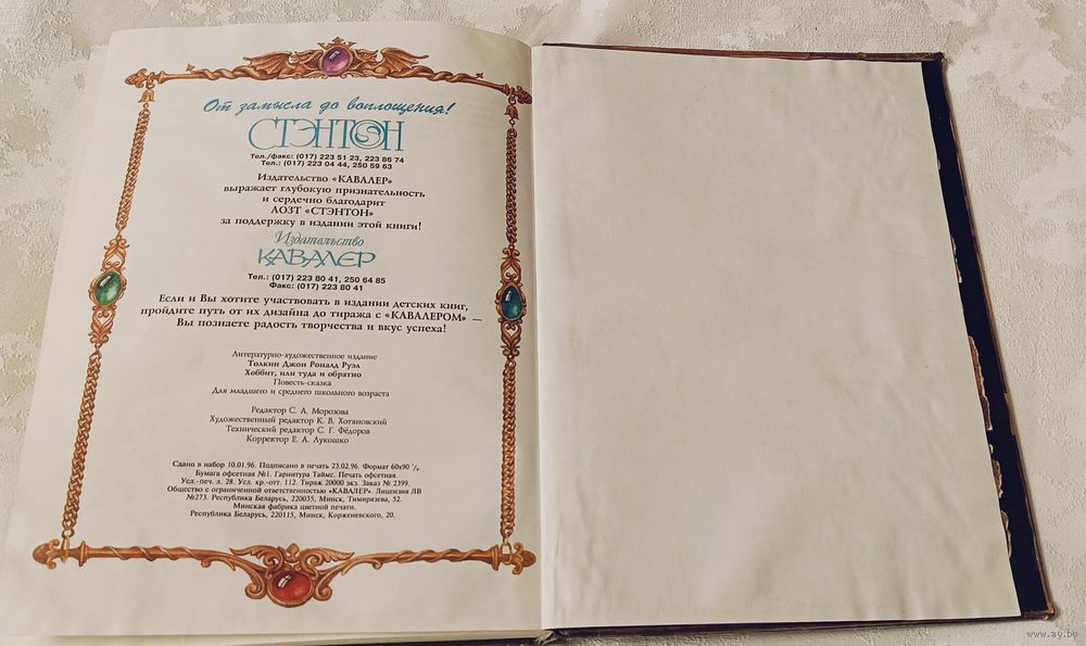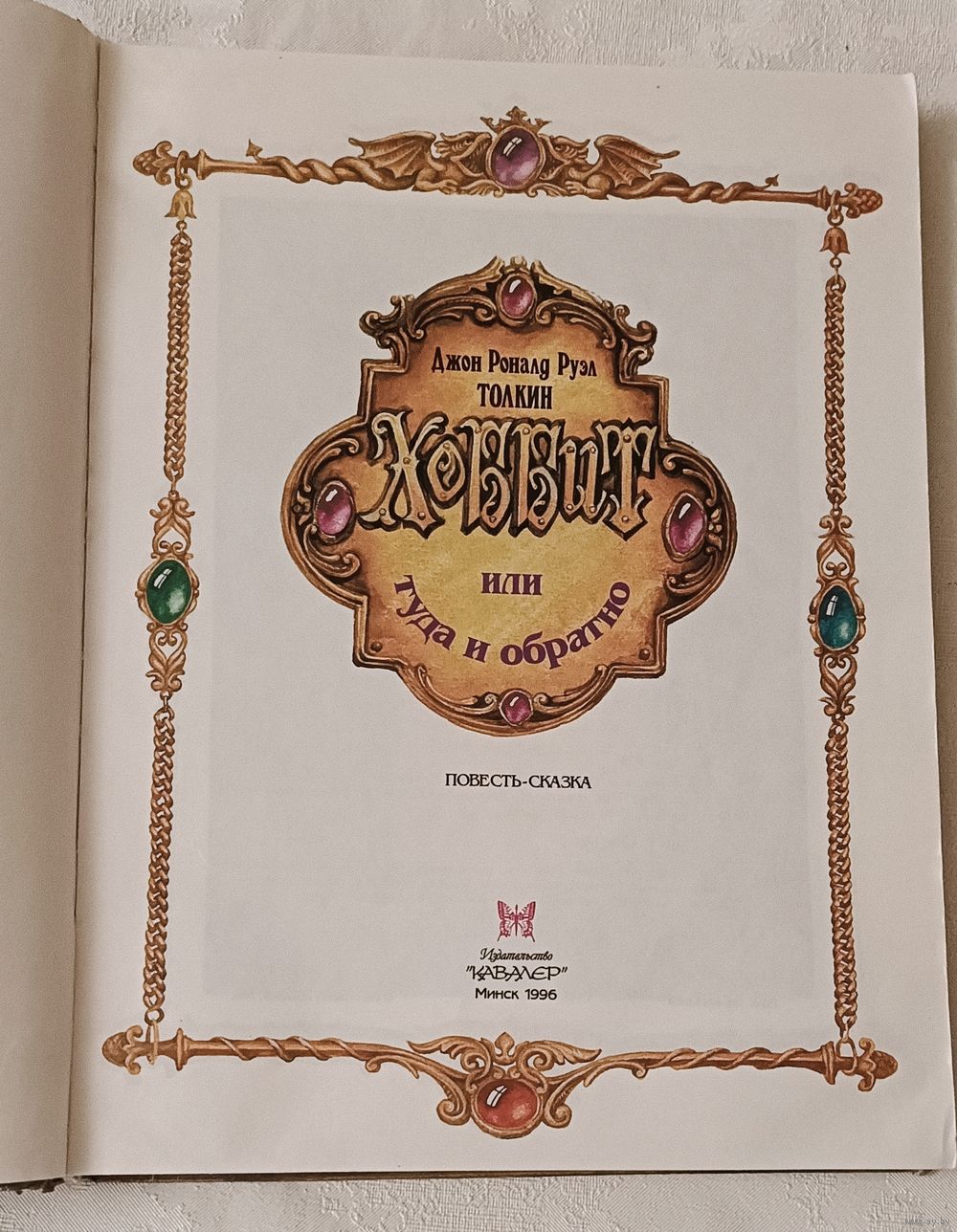 Толкин Дж. Р. Р. Хоббит, или туда и обратно: Повесть-сказка: Для мл. и сред. шк. возраста / Пер. с англ. Н. Рахманова; Худож. Н. Байрачный. — Мн.: Кавалер, 1996. — 224 с.: илл., твёрдый переплëт, энциклопедический формат.