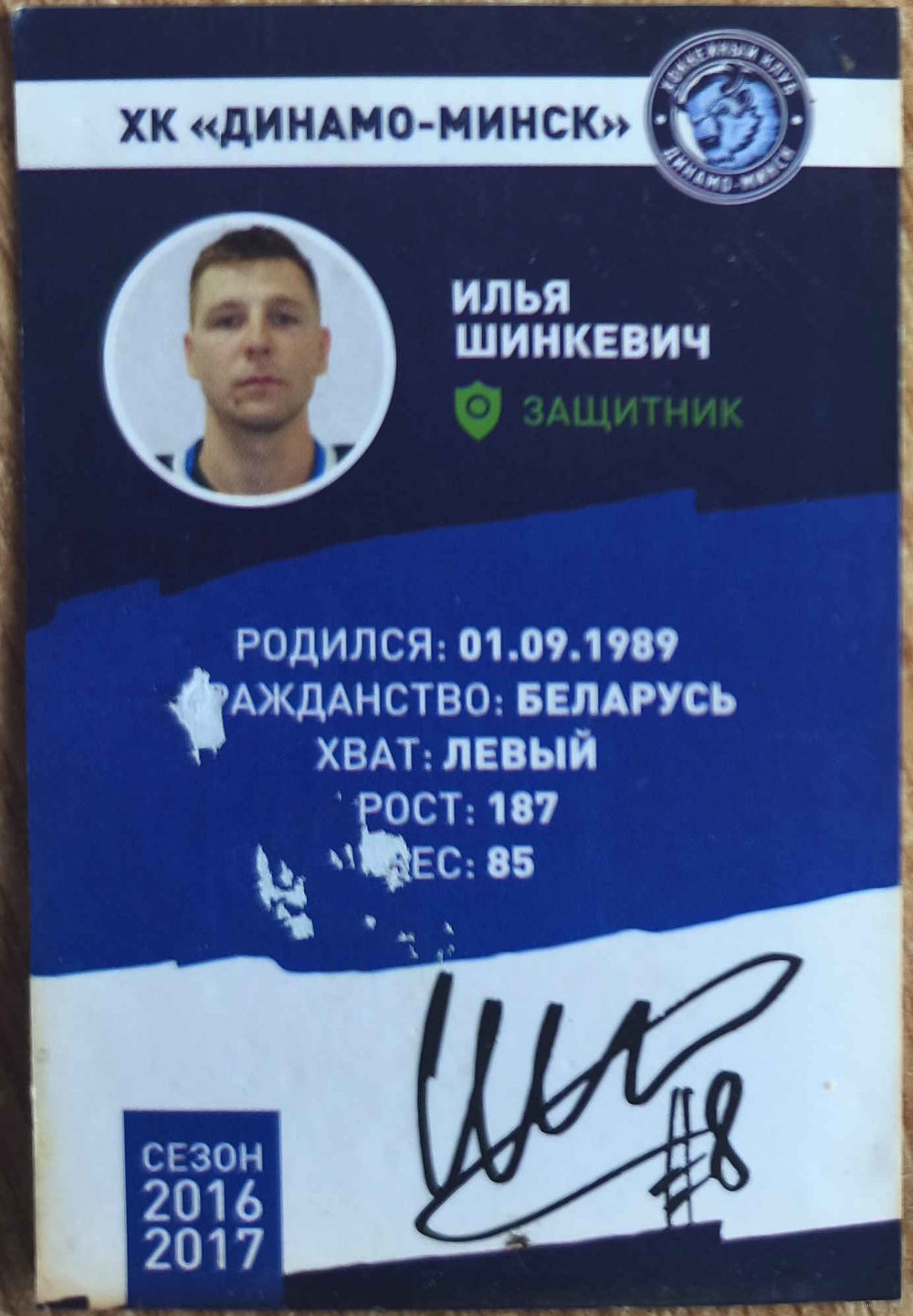 Хоккейная карточка ХК "Динамо Минск". Сезон 2016-2017. N 8 Илья Шинкевич