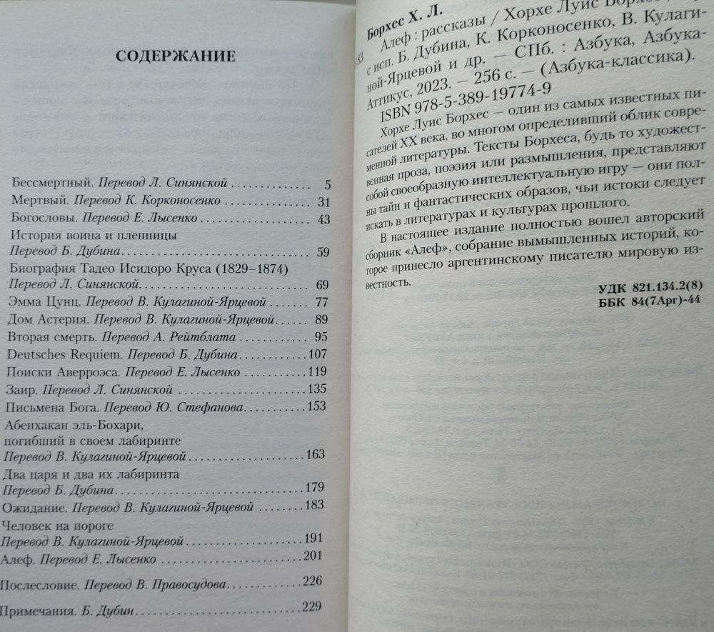 В настоящее издание полностью вошел авторский сборник «Алеф», собрание вымышленных историй, которое принесло аргентинскому писателю мировую известность.
