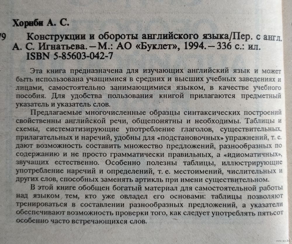 Хорнби А. С. Конструкции и обороты английского языка. Перевод с английского А. С. Игнатьева. Художественное оформление Г. А. Еремеев. М.: Буклет, 1994г., 336 с., илл. Мягкий переплёт, обычный формат.