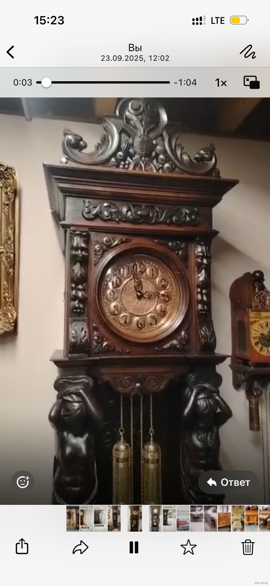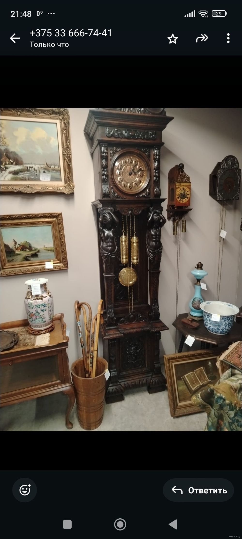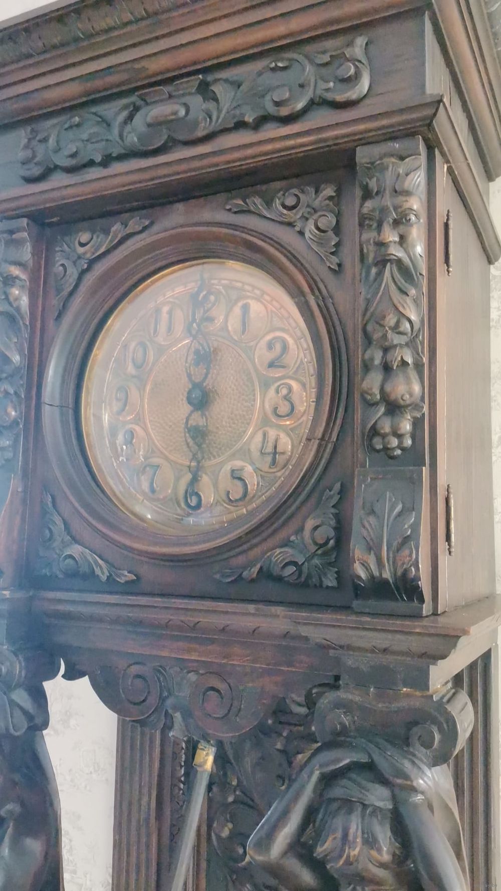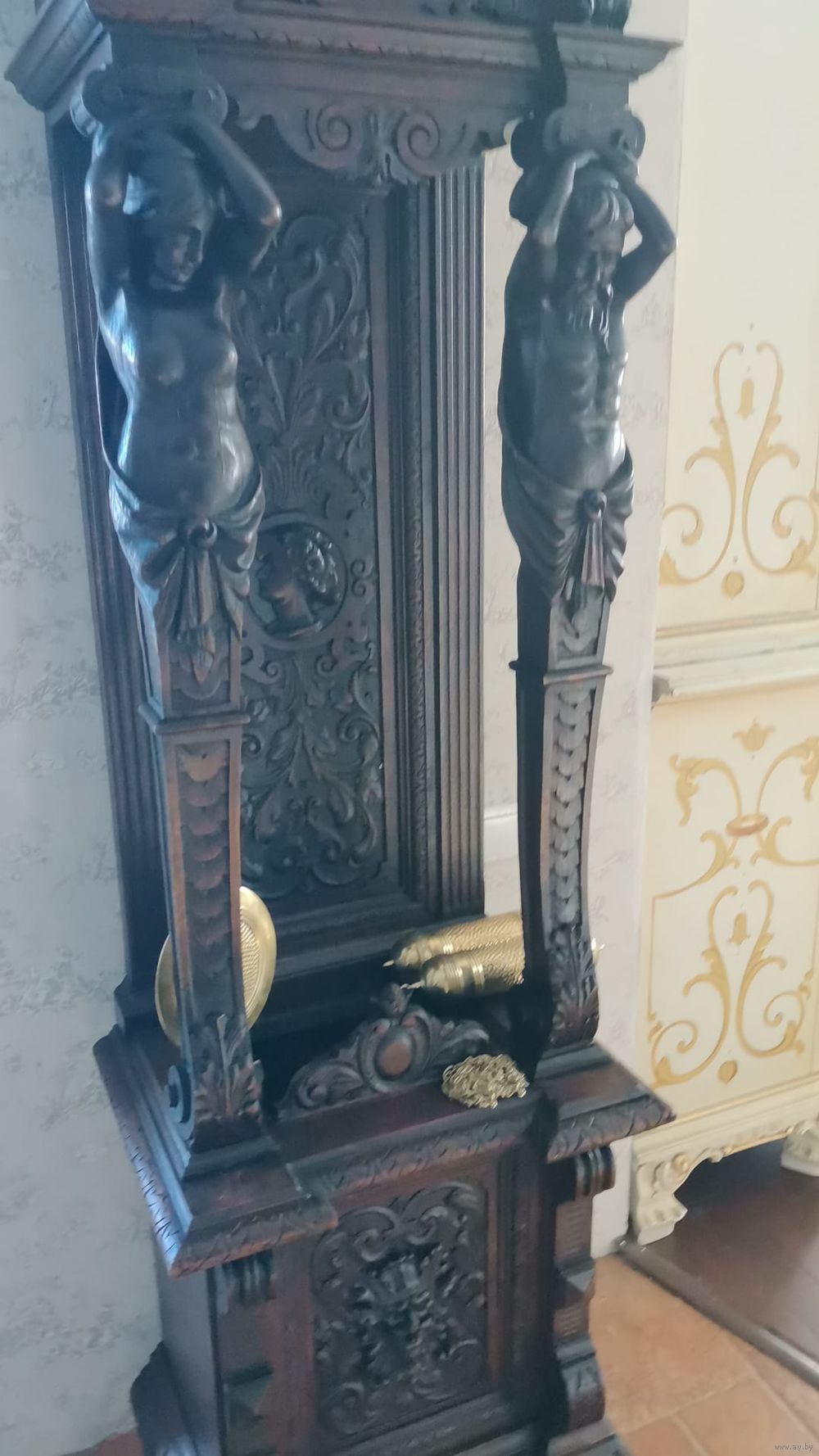 Продаю большие старинные напольные часы с боем, Германия, мануфактура Matthias Bäuerle (Матиас Бауери), ориентировочно 1905–1916 гг.; марка ценится за немецкое качество механизмов и узнаваемость на рынке антиквариата (историческое производство St. Georgen, экспорт); корпус массив ореха, высокий “hall/longcase” с богатой резьбой и фигурами-кариатидами, мощный карниз, витринная дверь маятникового отсека, сохранённая патина; без вмешательств и потерь — всё в родном и подлинном состоянии; механизм обслужен часовым мастером, ход уверенный, бой приятный, глубокий и красивый; часы из личной коллекции, отличный подарок и предмет интерьера/инвестиция; доп. фото/видео и информация — звоните/пишите; возможна рассрочка, разумный торг при осмотре.