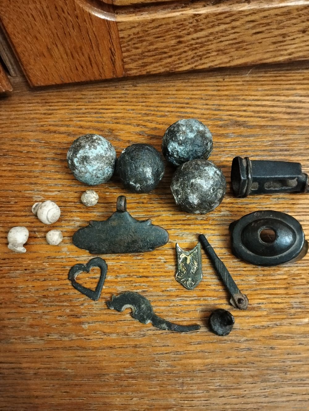 Предметы с одного бивака. Диаметр картечи 25-26 мм. Вес 88-90 грамм . Оконечник в позолоте мундира офицера |