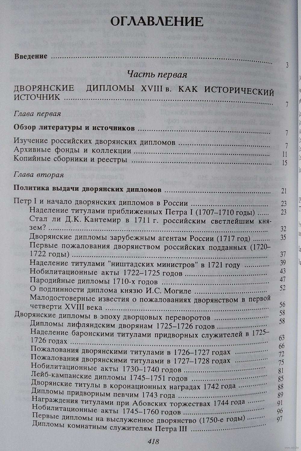 Рассматривается история выдачи дипломов на дворянство, гербы и титулы в России XVIII в. Выявлен 651 диплом 1707 - 1801 гг., перечень которых помещен в книге. Учтены все дипломы XVIII в., сохранившиеся в оригинале или в виде отпусков, копий и известные только по упоминаниям в реестрах, делопроизводственных материалах, литературе. Прослежена политика правительства в сфере выдачи дипломов и реконструируется процедура производства по составлению этих актов. Проблема исследуется в российской историографии впервые. Тираж: 800 экз.
