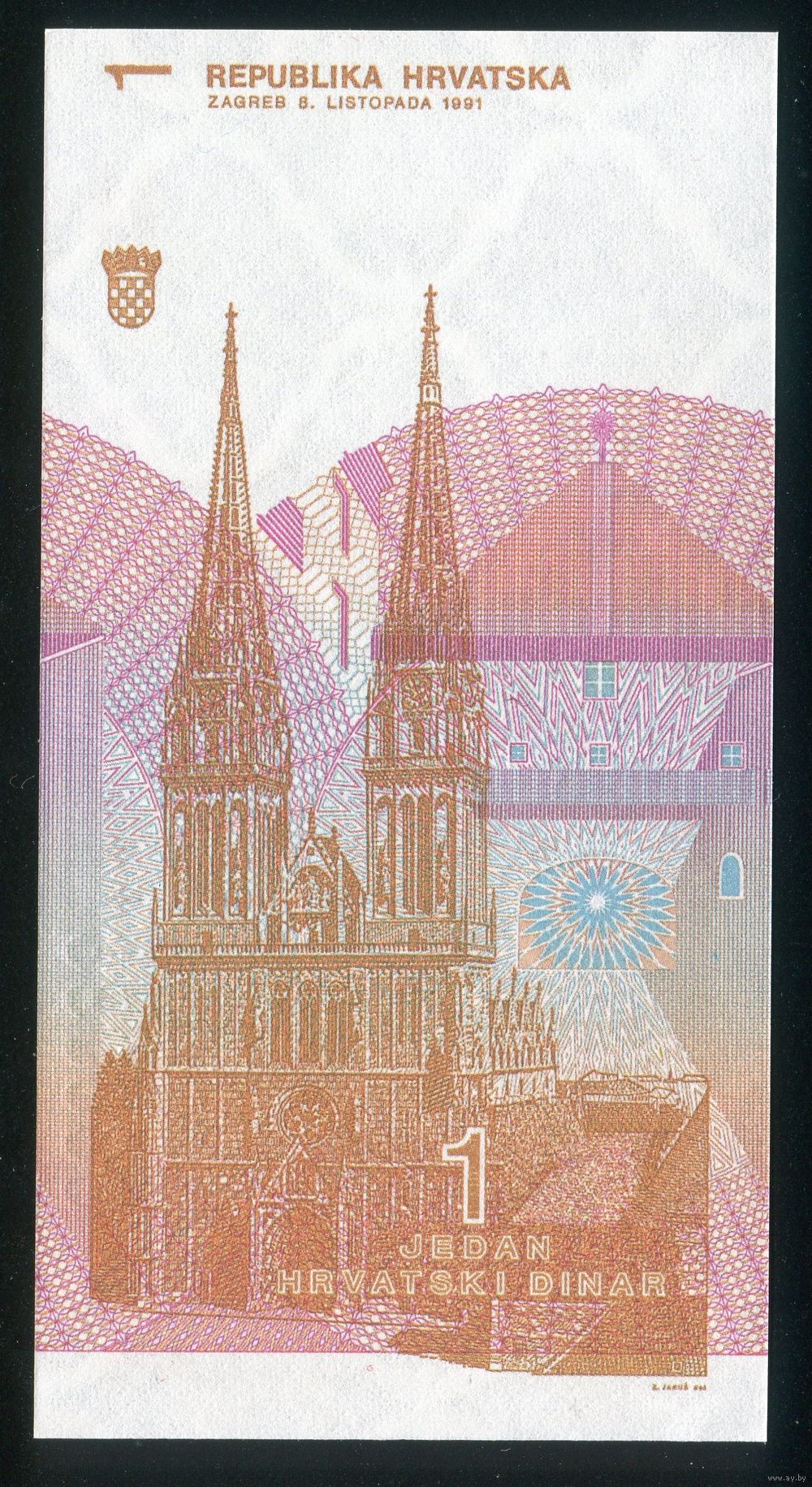 Хорватия 1 динар 1991 г. P16. Серия E. UNC