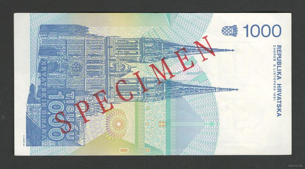Хорватия 1000 динар 1991 года. Тип Р-22. Образец (specimen). Состояние aUNC