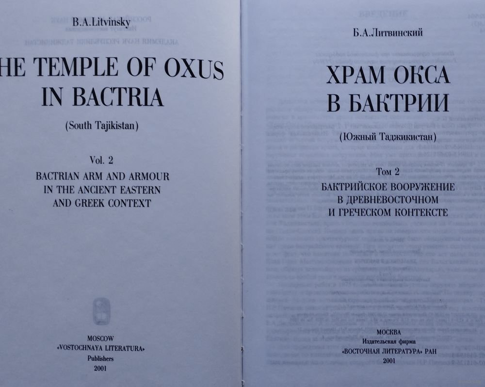 Цена за 2 тома. Большой энциклопедический формат. Тираж 700 экз. 858+528 стр. Знаменитый бактрийский Храм Окса был воздвигнут в конце IV — начале III в. до н.э. и просуществовал до III-IV в. н.э. В процессе раскопок сокровищницах храма Окса было обнаружено свыше 8000 предметов, в том числе много произведений искусства и художественного ремесла. Комплекс представленного в храме Окса вооружения охватывает огромный исторический период, с VI в. до н.э. до IV-V вв. н.э., т.е. около тысячи лет. Анализ показал, что основная серия на- ходок относится к VI–IV вв. до н.э., причем среди них есть ахеменидские и греческие произведения искусства и оружие.