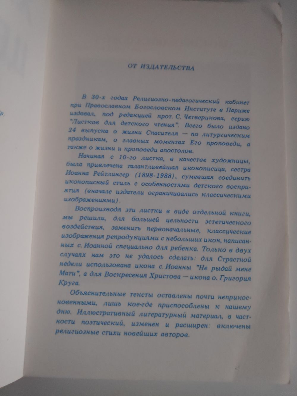 В 30-х годах Религиозно-педагогический кабинет при Православном Богословском Институте в Париже издавал, под редакцией прот. С.Четверикова, серию «Листков для детского чтения». Всего было издано 24 выпуска о жизни Спасителя — по литургическим праздникам, о главных моментах Его проповеди, а также о жизни и проповеди апостолов. Начиная с 10-го листка, в качестве художницы, была привлечена талантливейшая иконописица, сестра Иоанна Рейтлингер (1898-1988), сумевшая соединить иконописный стиль с особенностями детского восприятия (вначале издатели ограничивались классическими изображениями).