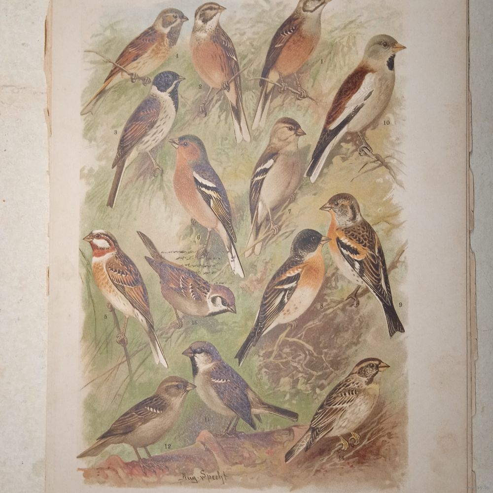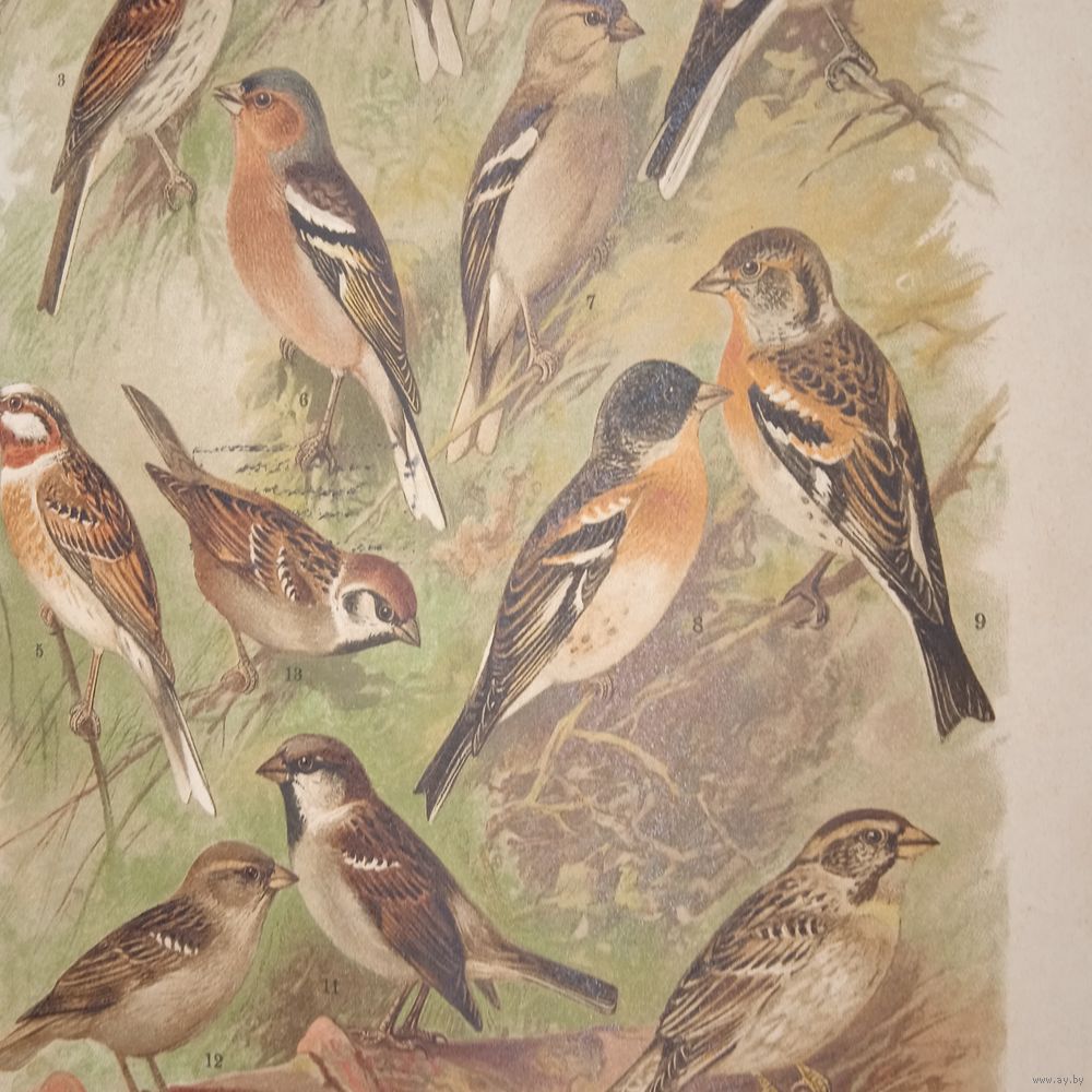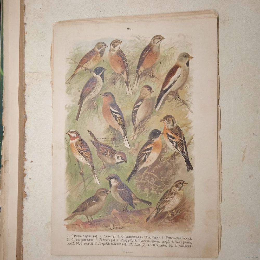ХРОМОЛИТОГРАФИЯ ПТИЦЫ . ОВСЯНКИ ЗЯБЛИК ВЬЮРОК ВОРОБЕЙ .21х29см. Энциклопедическая гравюра конец 19века 29х21см.