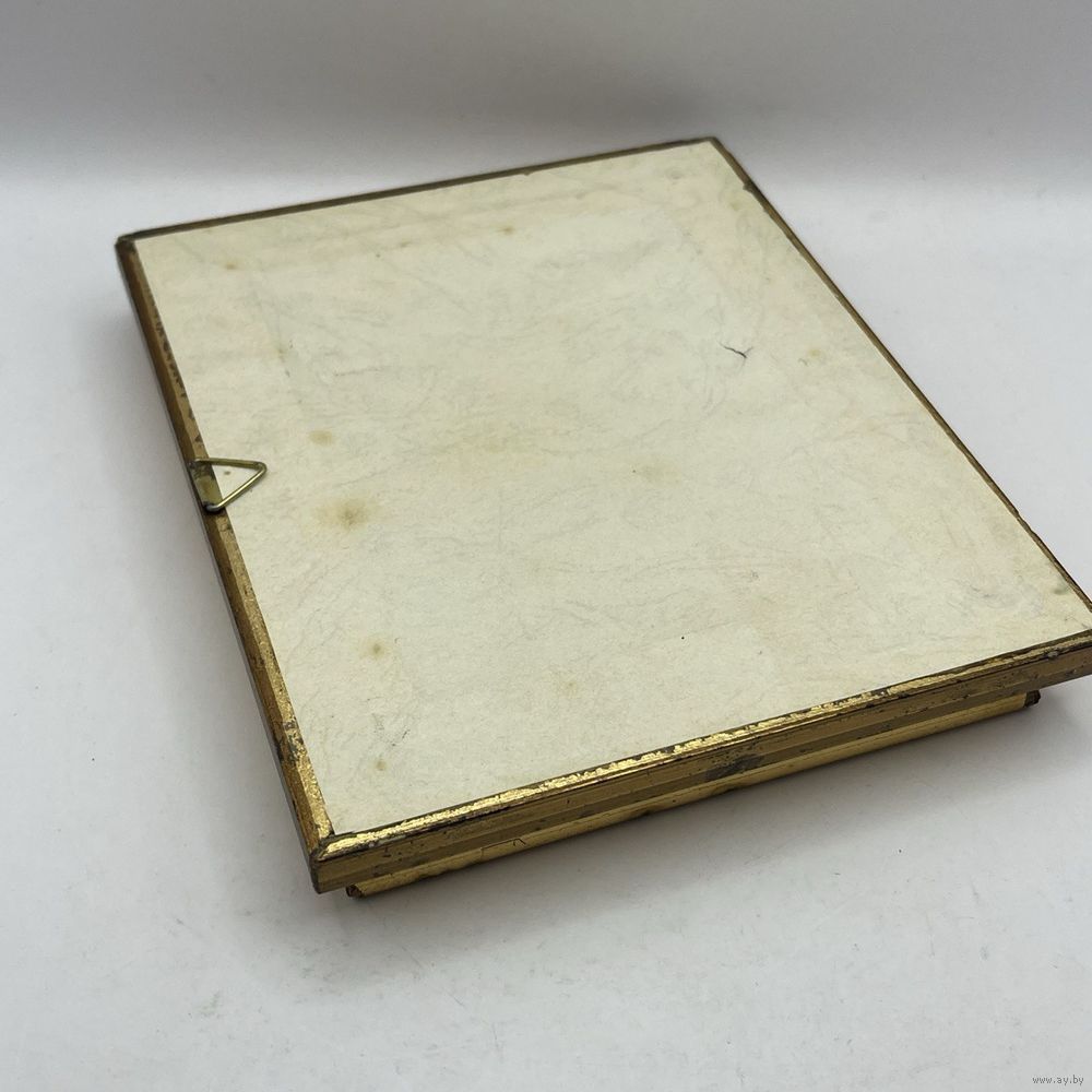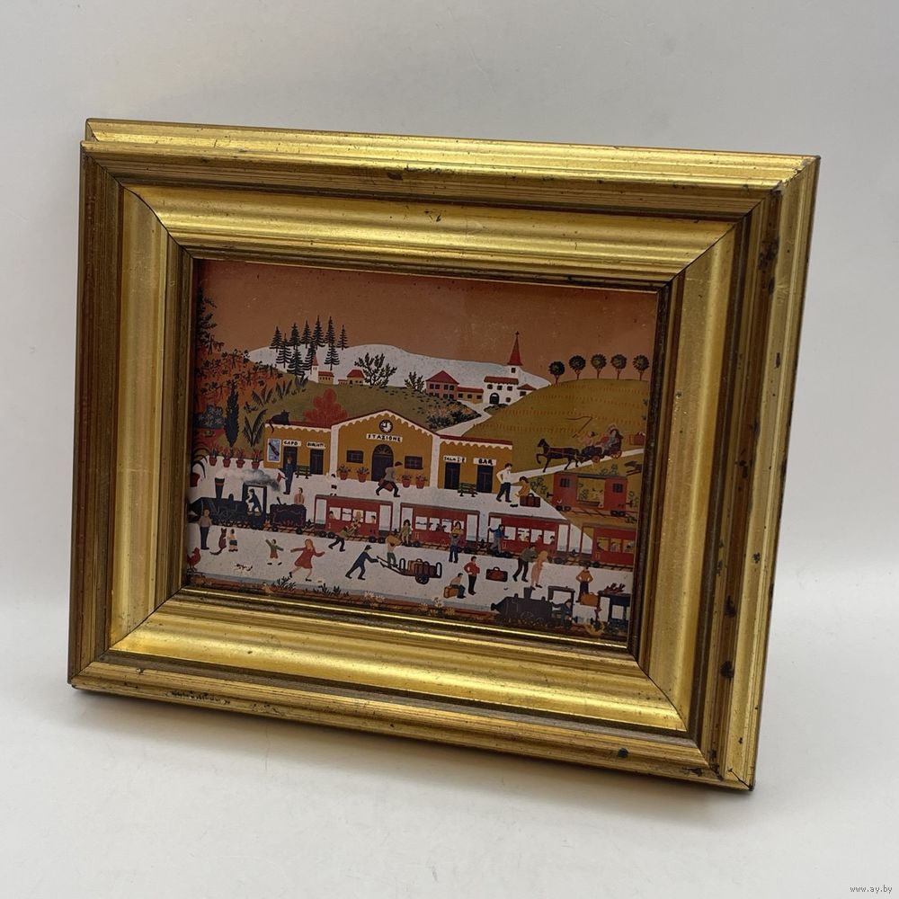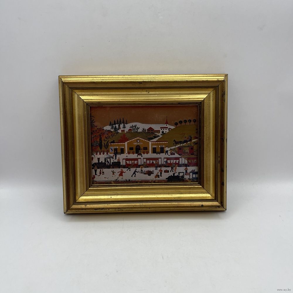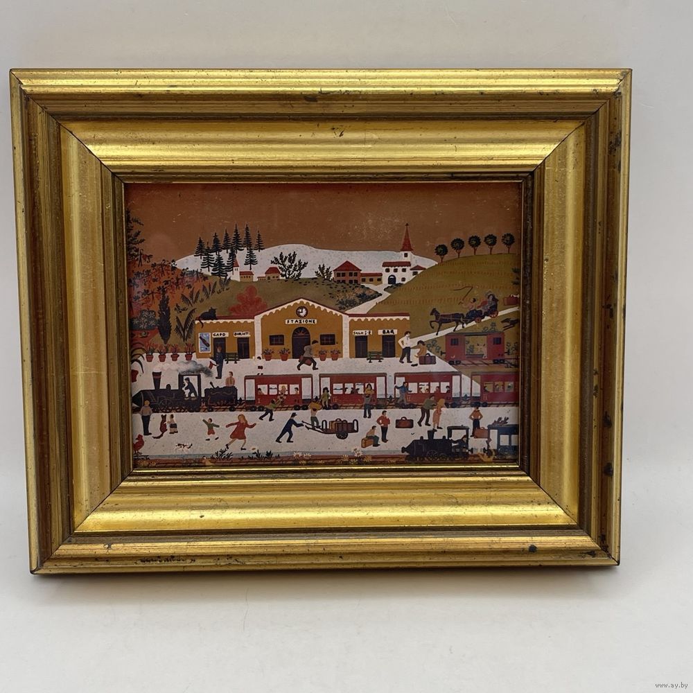 Антикварная миниатюрная картина-хромолитография ручной работы, выполненная в стиле наивного искусства на медной пластине. В деревянной раме ручной работы, под стеклом. Италия. 1950-е г.г. Размер 17 х 14,5 см. С подвесом. Следы времени на раме.