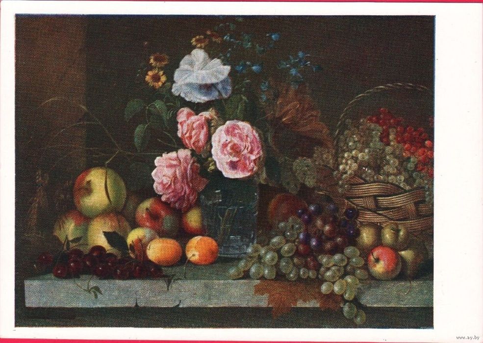 Хруцкий 61-е СССР Натюрморт с цветами фрукты виноград вишня корзина живопись