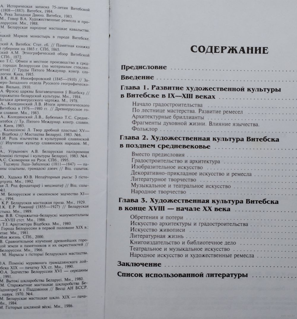 Большой энциклопедический формат. Ляссе. Тираж 3000 экз. 288 стр. Книга посвящена актуальной, но малоизученной в белорусском обществоведении теме — исследованию развития художественной культуры Витебска, одного из старейших городов Беларуси. На богатом фактологическом материале прослеживаются процессы становления и функционирования всех видов искусства, народного творчества в разные исторические периоды: раннее средневековье, Великое княжество Литовское, Речь Посполитая, Российская империя. Книга адресуется всем, кто интересуется национальной художественной культурой.