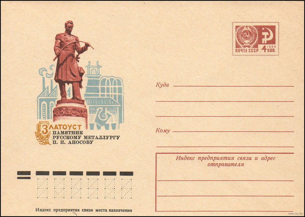 Художественный маркированный конверт СССР N 10026 (03.10.1974) Златоуст. Памятник русскому металлургу П.П. Аносову