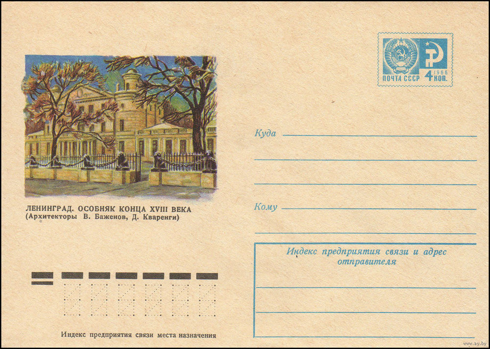 Художественный маркированный конверт СССР N 10157 (04.12.1974) Ленинград. Особняк конца XVIII века (Архитекторы В. Баженов, Д. Кваренги)