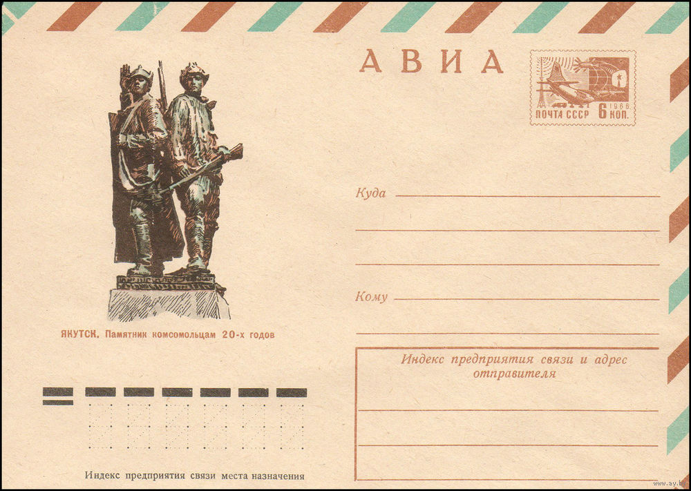 Художественный маркированный конверт СССР N 10336 (17.02.1975) АВИА Якутск. Памятник комсомольцам 20-х годов