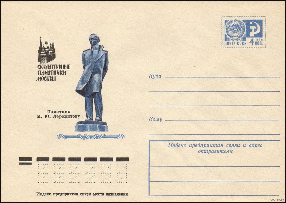 Художественный маркированный конверт СССР N 11242 (12.04.1976) Скульптурные памятники Москвы Памятник М.Ю. Лермонтову