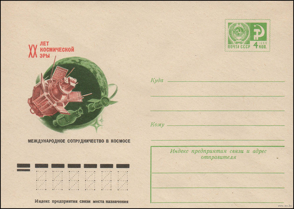 Художественный маркированный конверт СССР N 11296 (10.08.1977) XX лет космической эры Международное сотрудничество в космосе