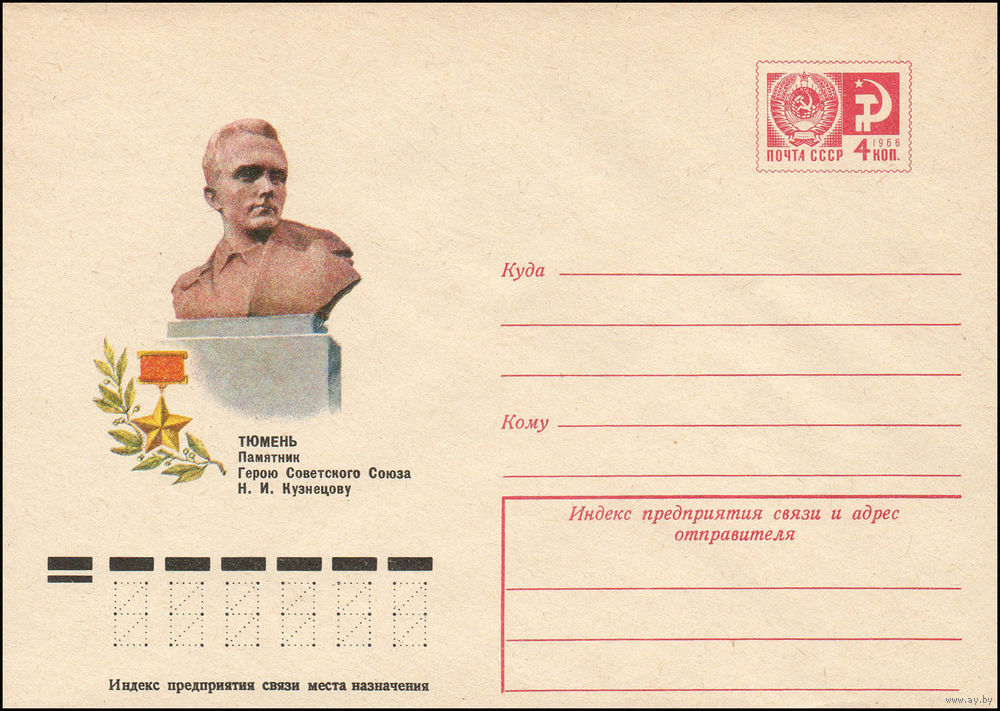 Художественный маркированный конверт СССР N 11371 (03.06.1976) Тюмень. Памятник Герою Советского Союза Н.И. Кузнецову
