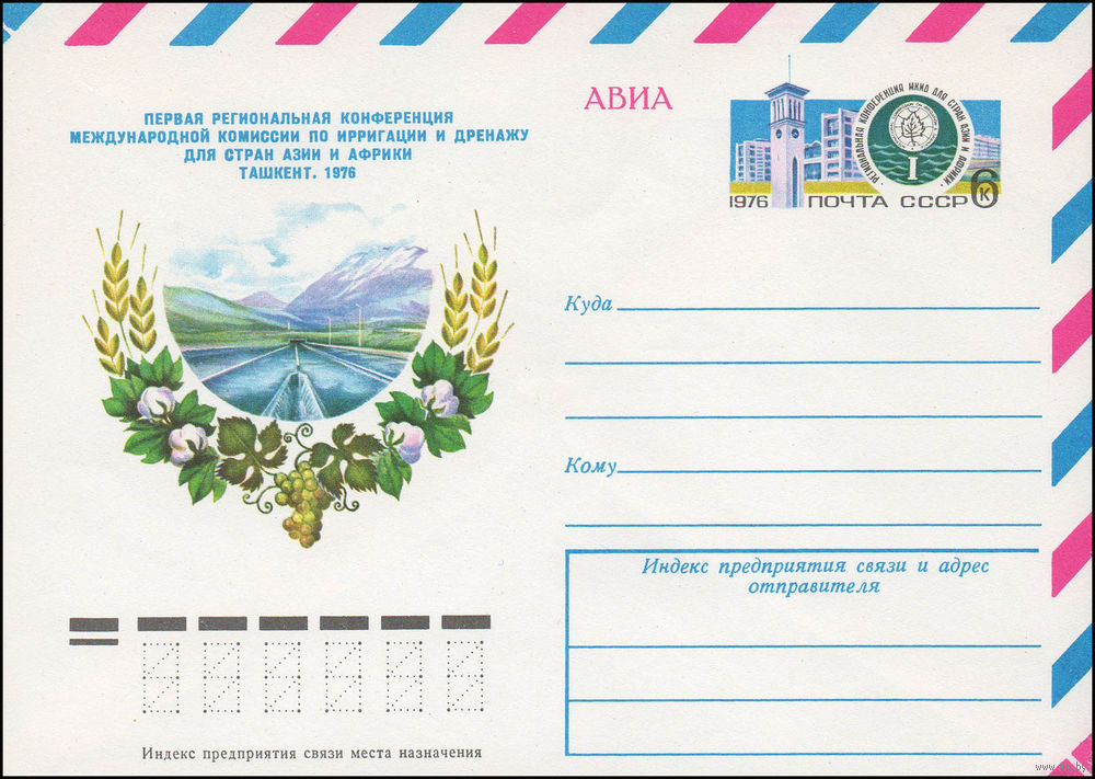 Художественный маркированный конверт СССР N 11523 (18.08.1976) АВИА Первая региональная конференция Международной комиссии по ирригации и дренажу для стран Азии и Африки Ташкент. 1976
