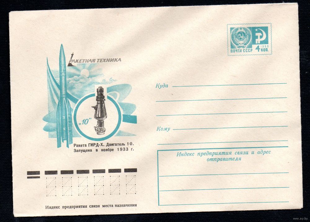Художественный маркированный конверт СССР N 11545 (30.08.1976) Ракетная техника Ракета ГИРД-Х. Двигатель 10. Запущена в ноябре 1933 г.