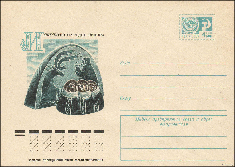 Художественный маркированный конверт СССР N 11846 (01.02.1977) Искусство народов Севера В.Н. Тырлов. "Хозяин тундры", "Трио".