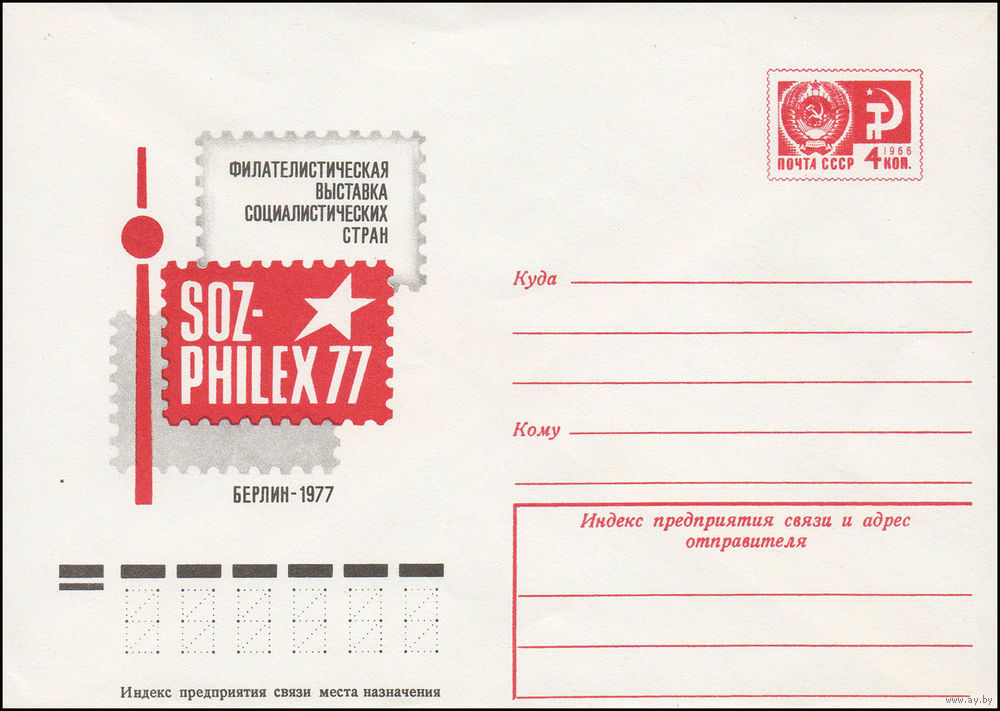 Художественный маркированный конверт СССР N 11883 (17.02.1977) Филателистическая выставка социалистических стран SOZPHILEX 77 Берлин 1977