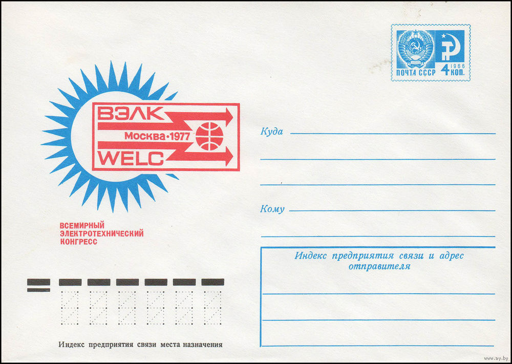 Художественный маркированный конверт СССР N 11910 (22.02.1977) ВЭЛК Москва 1977 Всемирный электротехнический конгресс