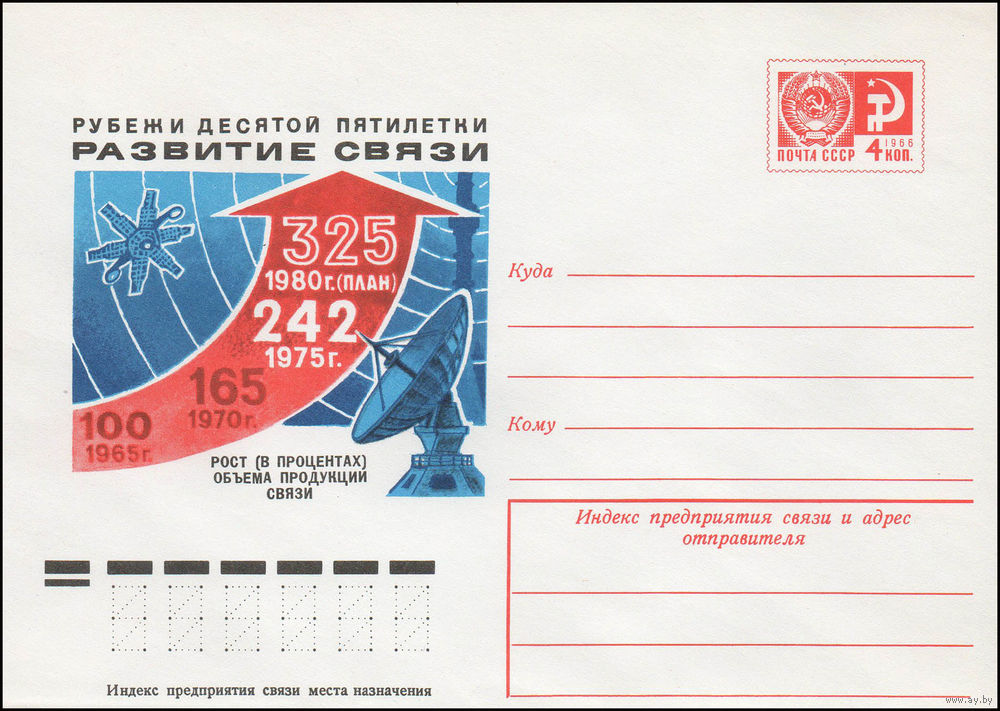 Художественный маркированный конверт СССР N 11964 (22.03.1977) Рубежи X пятилетки. Развитие связи Рост (в процентах) объема продукции связи