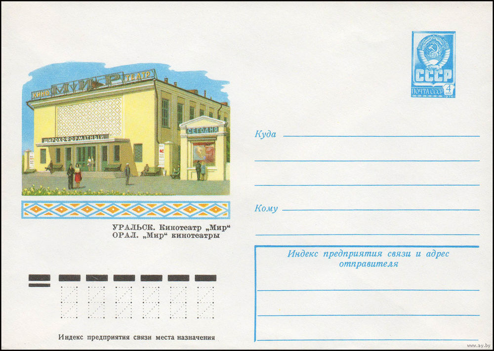Художественный маркированный конверт СССР N 11984 (06.04.1977) Уральск. Кинотеатр "Мир"