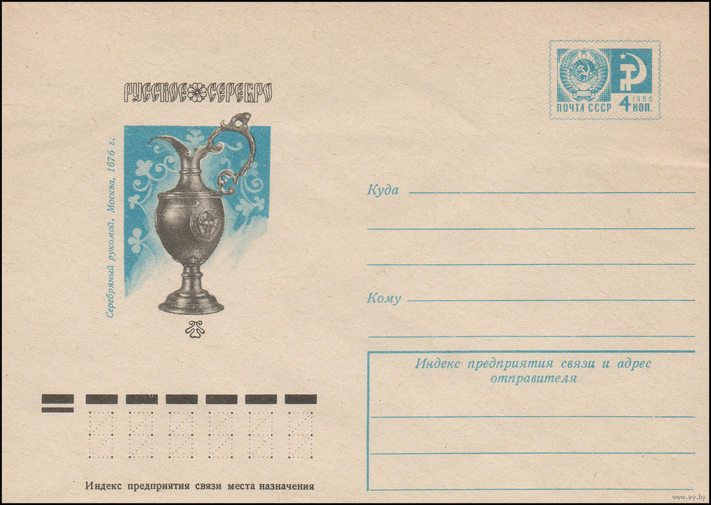 Художественный маркированный конверт СССР N 12025 (27.04.1977) Русское серебро Серебряный рукомой. Москва, 1676 г.