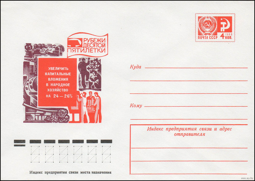 Художественный маркированный конверт СССР N 12096 (26.05.1977) Рубежи десятой пятилетки Увеличить капитальные вложения в народное хозяйство на 24-26%