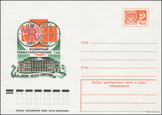 Художественный маркированный конверт СССР N 12109 (30.05.1977) 1977 Всемирный ревматологический год Москва. Институт ревматизма
