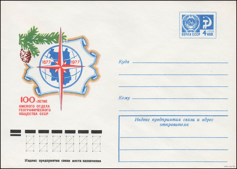 Художественный маркированный конверт СССР N 12140 (07.06.1977) 1887-1987 100-летие Омского отдела Географического общества СССР