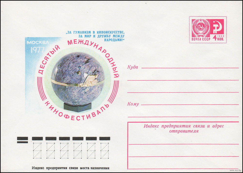 Художественный маркированный конверт СССР N 12155 (14.06.1977) Москва 1977 Десятый Международный кинофестиваль "За гуманизм в киноискусстве, за мир и дружбу между народами"
