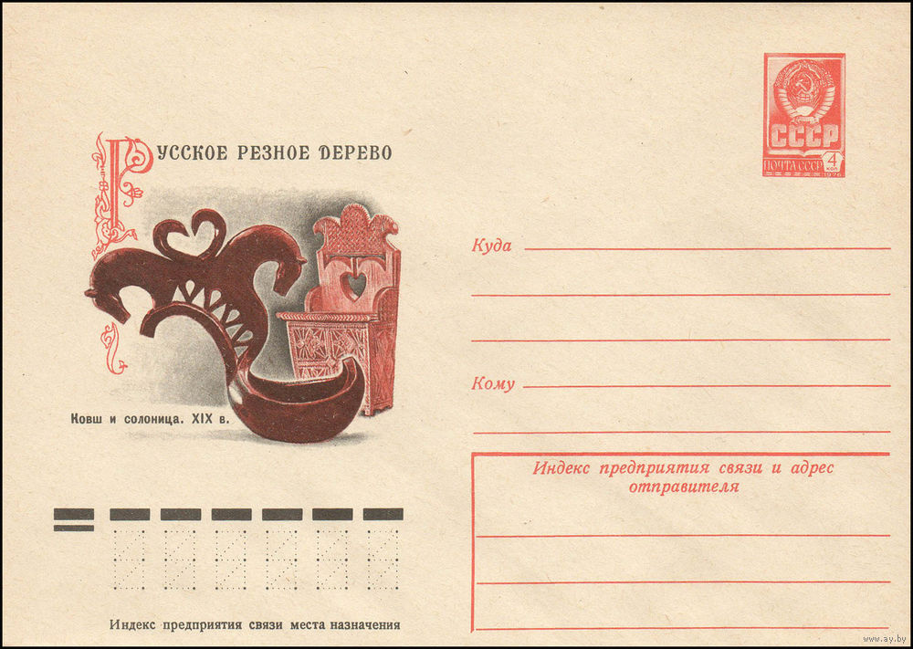 Художественный маркированный конверт СССР N 12342 (30.08.1977) Русское резное дерево Ковш и солоница. XIX в.