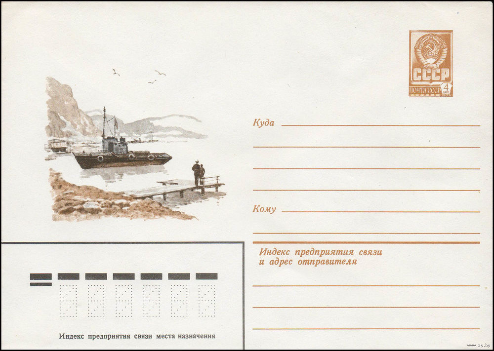 Художественный маркированный конверт СССР N 13528 (22.05.1979) Морской пейзаж с пристанью и буксиром у берега