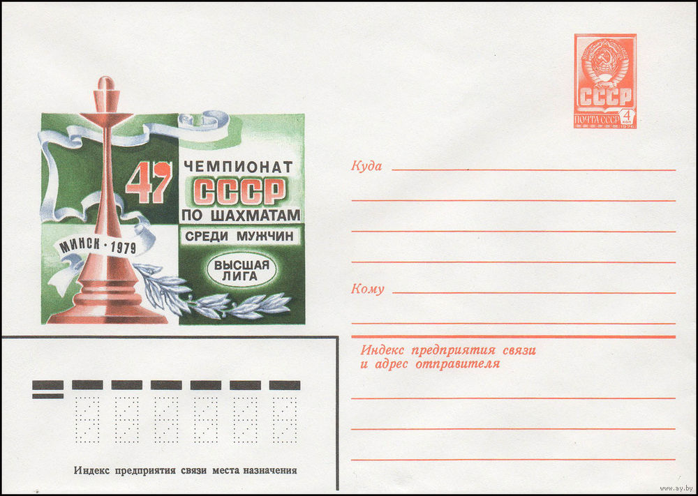 Художественный маркированный конверт СССР N 13726 (29.08.1979) 47 чемпионат СССР по шахматам среди мужчин Высшая лига Минск 1979