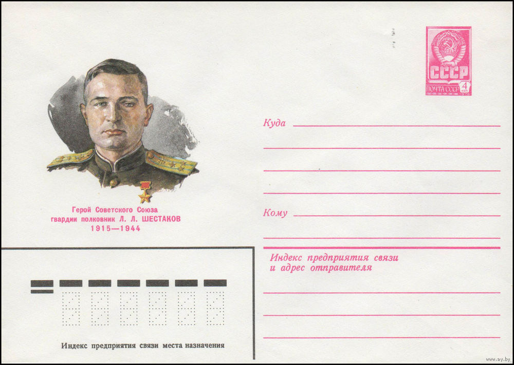 Художественный маркированный конверт СССР N 14070 (22.01.1980) Герой Советского Союза гвардии полковник Л.Л. Шестаков 1915-1944