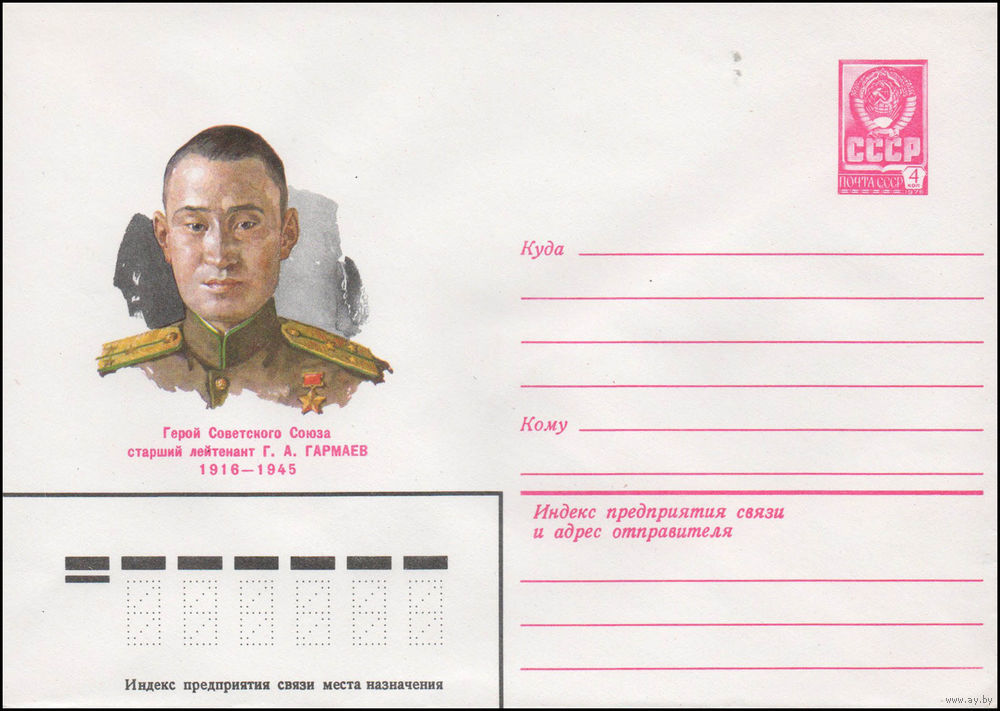 Художественный маркированный конверт СССР N 14320 (21.05.1980) Герой Советского Союза старший лейтенант Г. А. Гармаев 1916-1945